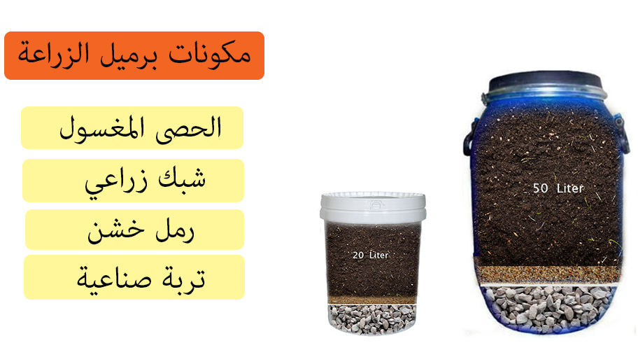 أول ما ستراعي هو حجم البرميل المناسب للزراعة و يفضل إلا يقل عن 20 لتر خاصة في الأشجار , و فيما يلي مكونات البرميل الذي سوف تزرع بداخلة .