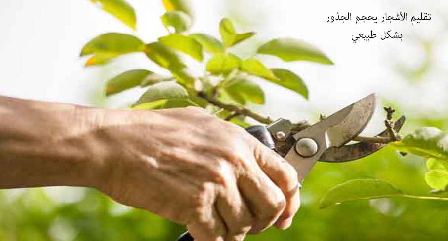 و في حال زراعة أشجار مستديمة الخضرة فأنه من السهل التحكم في المجموع الجذري من خلال تقليم المجموع الخضري , حيث أنه هناك نمو طردي متساوي بالنمو فكلما تمدد المجموع الخضري تمدد الجذر بنفس الكمية و المساحة .