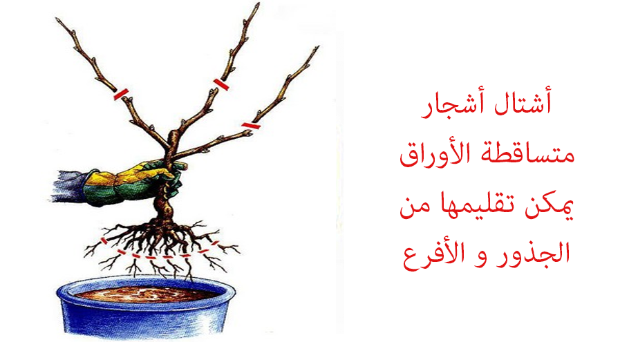 و من الجدير ذكرة أنه يفضل زراعة الأشجار المتساقطة الأوراق داخل الأصص و ذلك لسهولة التعامل معها و التحكم في المجموع الخضري والجذري بكل سهولة في وقت سكونها , مما يحافظ على حجم الأشجار و الأصيص بشكل جيد .